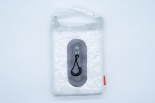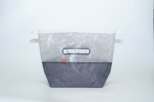 服が好きで高校時代電車に揺られ3時間ほどかけて東京に行った。裏原宿、渋谷には好きなブランドがいっぱい置いてあり、hectic.masterpiece.back channelやnitraidなど。BBCやICE CREAMも再燃しapeの店には海外のバイヤーが並んでいて、その中でも1番を取ってしまった僕ら高校生は、バイヤーに舌打ちをされながら並んでいた事も懐かしい。AGITOで竜人に会ったのもいい思い出だ。そんないい思い出の中でも一番よく覚えているのは、各店舗でもらえるショッパーだ。各店舗でもらえるショップの袋には、店舗のロゴや、ブランドのロゴがプリントされており、高校生だった僕は家に帰っても捨てる事なく大事に使っていた。使っているうちにボロボロになって捨ててしまったが、物を大事にする根底には、カッコ良いや可愛いは必要不可欠なのかもしれない。サスティナブル、サスティナブルと嘆かれる時代。エコ素材を使う事も勿論だが、少し古くなったくらいでは捨てられない様な物を作ることも大事である。そんな事を根底に置きながら、あの時代の雰囲気を纏って今回は完成させました。ファブリックはdcf素材を使い、軽量に仕上がってます。dcfが出せる独特な風合い、透け感、そしてシワが増えるほどに経年変化していく見た目。このエコバックには使えば使うほど味が出てくる楽しみもあります。まず制作に取り掛かった時に、初めは隠しマチを使って、折り畳み易さに振り切り、そこに加えて収納時にバッグの様に見える作りにしました。確かに見た目はカッコいいのですが、折り目がつきやすいdcfに隠しマチは適しておらず展開に時間がかかってしまいエコバック用途だと使いづらい。収納の機構についても、伸び縮みしないdcfには適さずボツに。かっこいいだけでは上手くいかないなーとまた悩む。次に考えたのが紙袋タイプのショッパー。折り目に沿って畳みやすく、dcfも折り目がつきやすい為試してみた。完璧や。でもこれじゃあ、、初っ端から何も考えずに作れば出来そうなタイプのエコバックじゃんか、、、。と落胆しつつ、遠回りが1番の近道と言い聞かせ、その過程を箇条書きで成仏させる。
