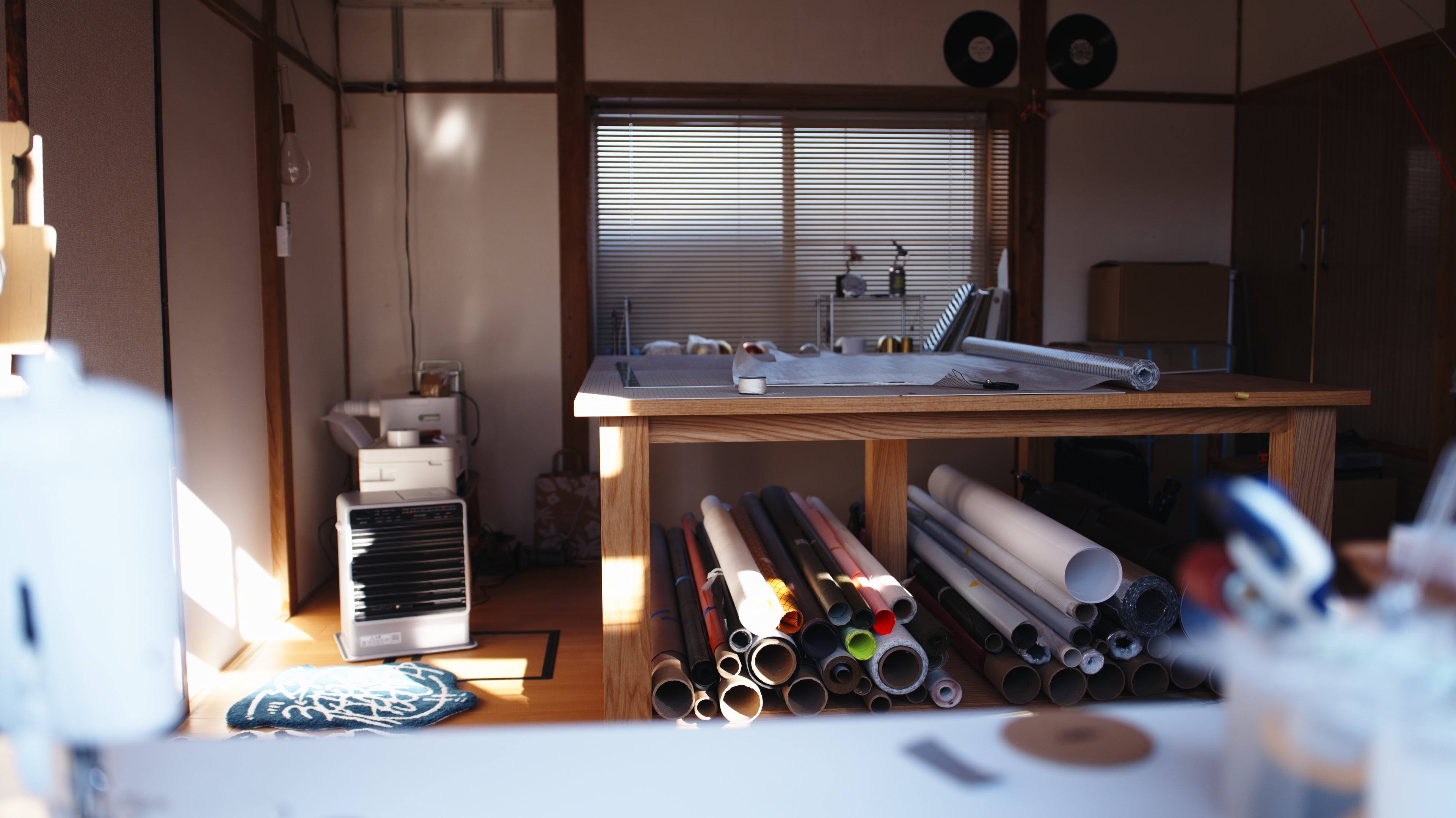 始まりはゴールゼロの直視した時の眩しさが少し強く感じたことから始まりました。この眩しさを少し軽減できればいいな。そんな誰もが思ったであろう事を、何があればクリアできるのかをひたすらに妄想しました。光と人間の間に一枚布があれば少し軽減されらるのか、、色んな想像を巡らせ、ゴールゼロに合うシェードを作る事にしました。作ると言っても簡単では無い。ミシンをまともに扱った事がなかった自分は、まずボビンはどうやって巻くのか、どんな針を使えば?、どんな糸を使えばいいの?全てが手探りの状態でありました。家庭科の勉強のような事から始まり、少しずつミシンに慣れていく。ミシンの基礎がない内は、縫う作業自体がままならず、糸がよれたり、強度が出なかったり、、何事も基礎が大事だという事は、今まで色んなカルチャーに触れながら痛いほど分かっていただけに、手を抜けませんでした。オーリーが下手なキックフリップなど見るに堪えないから。ミシンに慣れる作業とシェードの妄想を繰り返す内に、下手なラフ絵を完成させ、寸法を計算し、これを作ってみよう!と言うところまではいった。あとはファブリック(生地)をどうしようか。やっぱり光を使うなら、光を活かせるものがいい。アウトドアファブリックを探し回り、これだ!と言うものを見つけます。昨今色んなブランドで使われているXPACである。XPACとは3層構造からなるファブリックで、強度、軽さ、防水性を併せ持つ、アウトドアの為に生まれたような生地であります。また特徴としてXに格子状の柄が入っている。この上柄がゴールゼロの光によって、より強く浮かび上がったらカッコいいんではないか?と思い、シェードのボディをXPACに決めました。次に決めるのは、強い光を少し和らげる部分。ここで求められるのは、光を完全にシャットアウトする事ではなく、光を柔らかい光に変えること。その為には光をより透過させる必要がありました。薄いナイロンを選べばいいかな?そんな事を考えながら30Dのナイロンを買ったところ、ナイロンが滑りうまく縫えない。端がすぐにほつれる、、紆余曲折ありながら、シルナイロンにたどり着きました。答えはネットにいっぱい転がっている中、実際に触れてみないと納得がいかない部分が多くありました。でも失敗達は、今スキルの土台となって自分を支えてくれています。これでファブリックが決まりました。あとは目指すゴールをどうするか。光をより透過したいから薄い方がいい、色々なところに持っていけるように軽量の方がいい、ゴールゼロと一緒に持ち運べた方がいい、そんな事がぼんやりと浮かびながら、少しずつ事を進めていきました。そして試行錯誤していく内に完成したのが今の形です。ただ今も進化の途中であり、1stロットとは、コードストッパーや全体のシェイプ、使うナイロン生地も変わりました。初めから100点を出せれば、、そんな事を思いながら今日もギアを妄想しています。